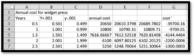 Looking at the data, the minimal annual cost is obtained by keeping the press between 5.5 and 6.0 years. Using Goal seek on the derivative, I find the minimal annual cost of $3,964.10 is obtained by keeping the press for 5.77 years.
